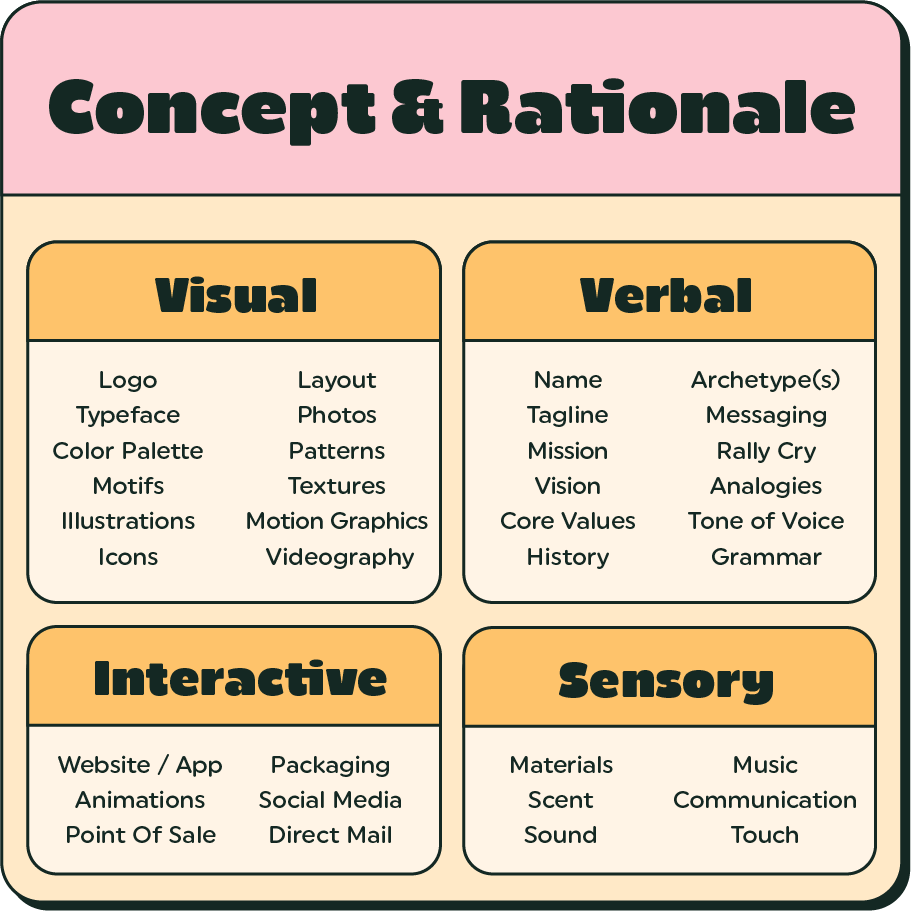 This chart shows the different components of a brand identity, broken into four categories: Visual, Verbal, Interactive, and Sensory. Each component is tied to the Concept & Rationale, or the story you're telling.